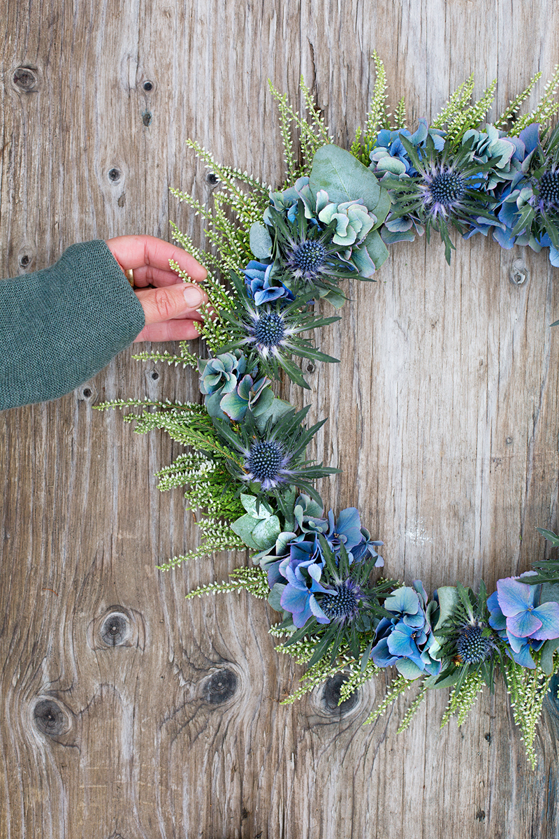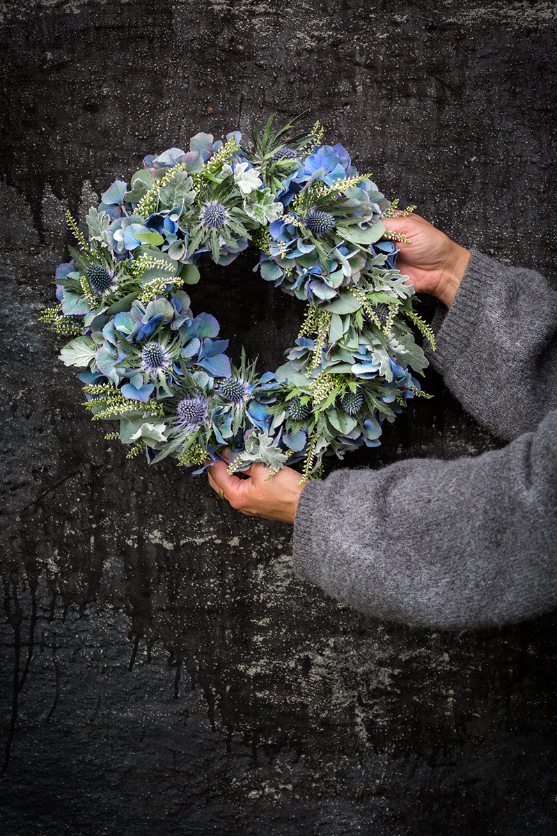 Skapa en praktfull krans i drömska toner av blått, lila och grönt. Här har vi använt oss av blå hortensia, ljung, tistel och eukalyptus. Bli inspirerad och skapa din egna krans eller beställ hem en färdigbunden.