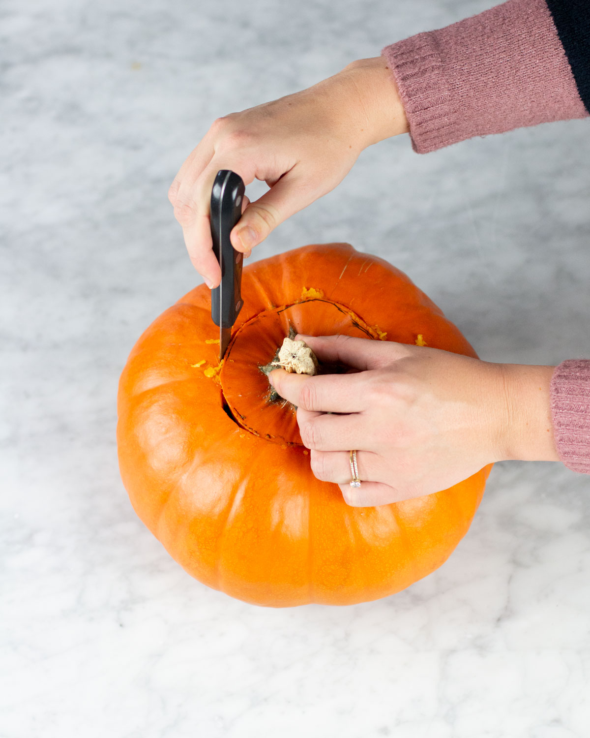1. Placera glasvasen upp och ner i mitten av pumpan. Markera med en penna runt vasen för att mäta ut hur stort hål du behöver göra.