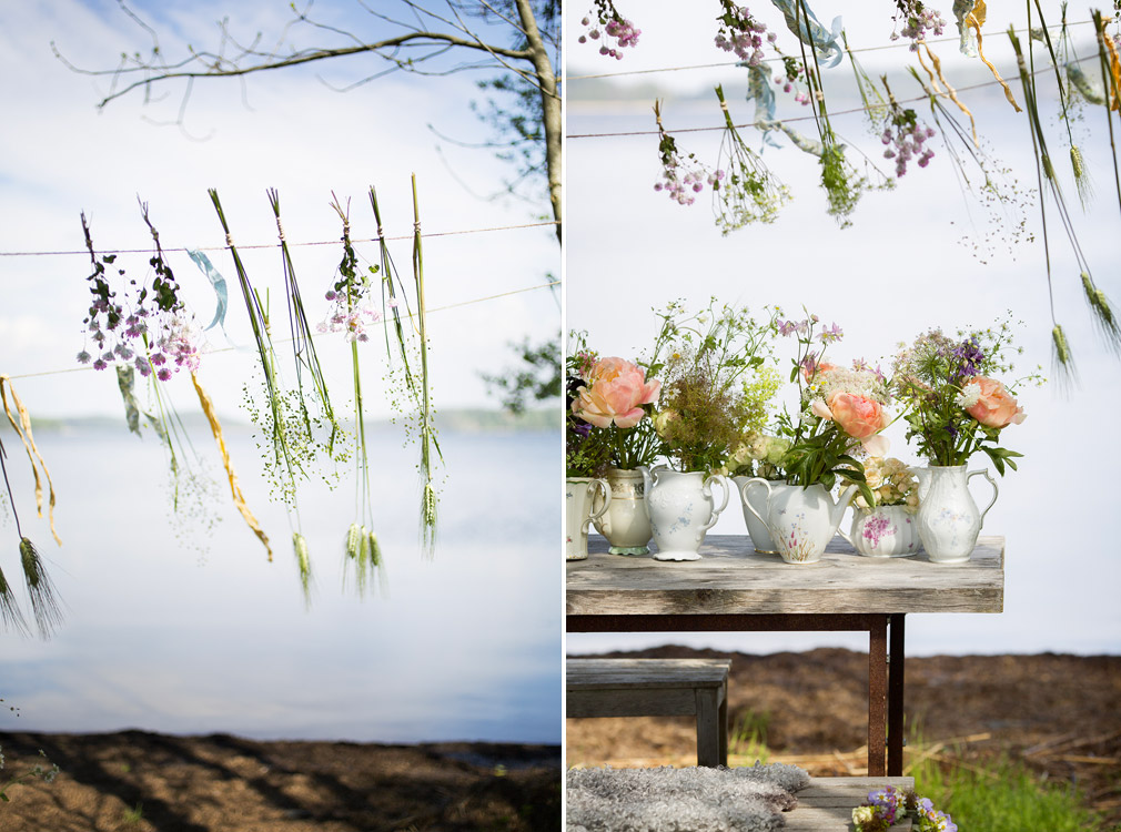 Ett annat tips är att tänka både högt och lågt. Det är fint att spänna ett natursnöre över det dukade bordet och låta det löpa ett par, tre varv fram och tillbaka likt en tvättlina. Knyt små buketter och häng dem upp och ner över linan. Långa strån eller ax av korn blir effektfulla om du binder dem två och två.