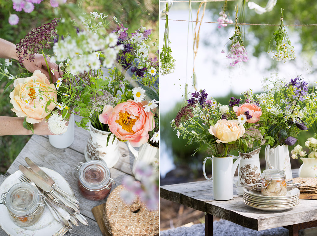 Nu är naturen som allra vackrast. I trädgårdarna blommar pioner, akvileja och daggkåpa, på ängarna prästkrage, hundkex och inte minst gräs. Plocka det du tycker om och fyll kannor som du ställer på bordet! Midsommar är högtiden då det är fritt fram att blanda vilt.