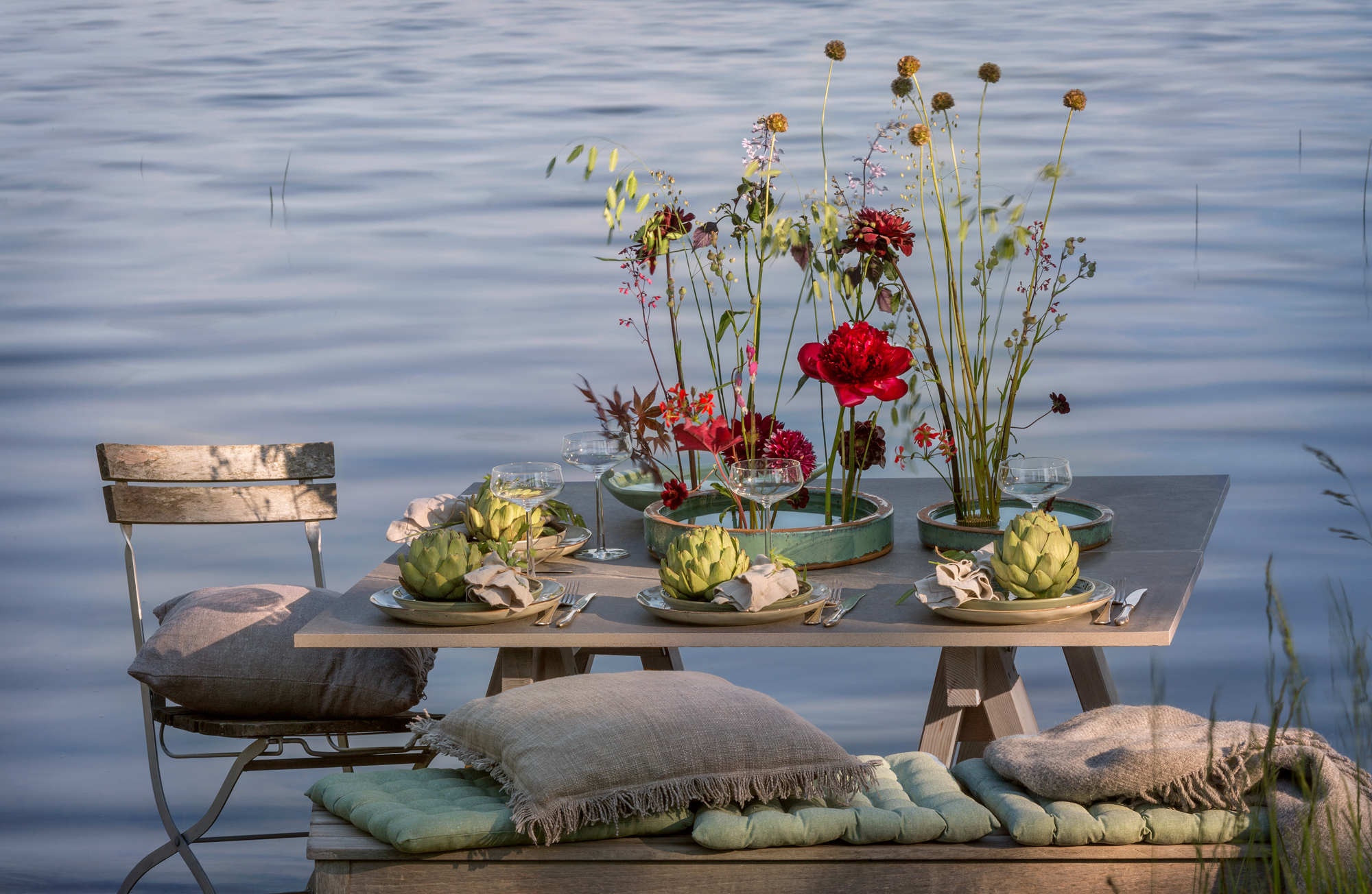 Blommor i dukningen: pioner, dahlia, solboll, iris, riddarsporre, trädgårdsros, kvistros, hortensia, lejongap.